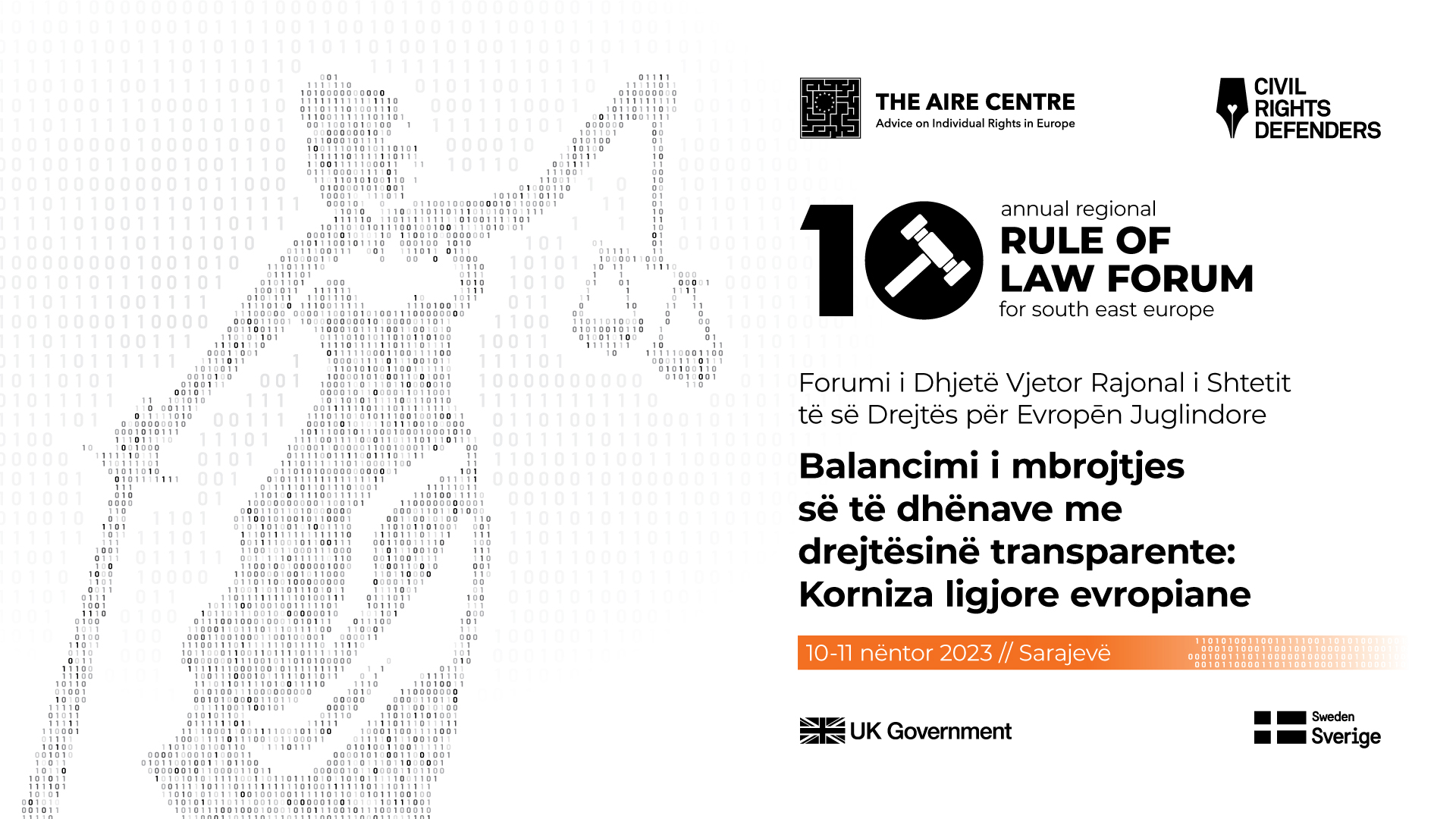 Forumi i Dhjetë Vjetor Rajonal i Shtetit të së Drejtes për Evropën Juglindore, organizuar nga Qendra AIRE dhe Civil Right Defenders, do të mbahet në Sarajevë, Bosnje Hercegovinë më 10 dhe 11 nëntor 2023. Ky aktivitet mbështetet nga Agjensia Suedeze për Bashkëpunim dhe Zhvillim Ndërkombëtar dhe Qeveria e Mbretërisë së Bashkuar.